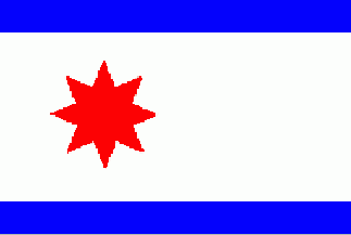 It is a white flag with horizontal blue stripes on both edges. In the white field is a red 8-point-star shifted to the hoist.