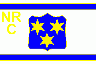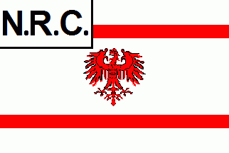 The white flag is horizontally divided by two narrow red stripes. In the centre between the stripes is the red eagle of the electorate of Brandenburg. The white canton has a black inscription of dotted capitals "N.R.C.". It is separated by black lines.