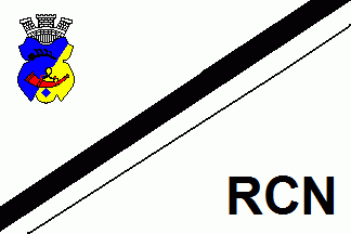 The white flag is divided per bend sinister by a black over white stripe. In the lower fly corner is a black inscription "RCN". In the upper hoist quarter is a coat of arms topped by a white mural crown. The shield is divided per bend sinister into blue and yellow. It contains all the elements from the local coat of arms as follows: a black antler, a red horn with a blue diamond.