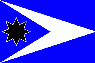 It is ablue flag divided by a white pile, which is superimposed by a blue pile. Both piles are forming a tip pointing to the fly. Shifted to the hoist is a black 8-point star fimbriated white.