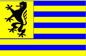It is a 10-stripes flag divided by alternating blue and yellow horizontal stripes starting with a blue one. The flag has a yellow bordure at the top edge and a yellow canton edged blue. In the canton is a black rampant lion armed and tongued red. The lion and the colours of the stripes are taken from the coat of arms of the city of Leipzig.