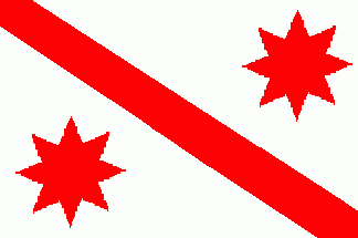 The white flag is divided per bend by a red stripe. In the lower hoist and upper fly corner are red 8-point stars.