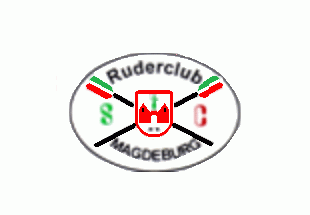 It is a white oval fimbriated black nearly divided by a pair of crossed oars showing the club's blade pattern red - white - green. At top and hoist are black embowed inscriptions "Ruderclub" and "MAGDEBURG", a green "S" is left, a red "C" right. In the middle is a simplified local coat of arms.