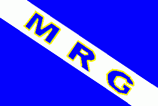 The blue flag is divided by a white bendy stripe. In the white stripe are blue capitals fimbriated golden yellow "MRG".