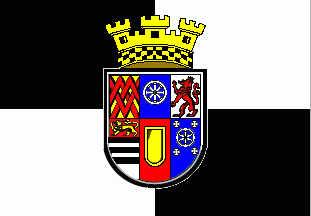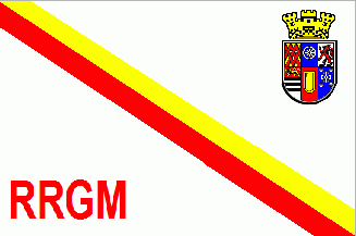 The white flag is divided per bend by a yellow over red stripe. In the lower hoist corner is a red inscription "RRGM", in the upper hoist quarter is the coat of arms of the city of Mülheim.