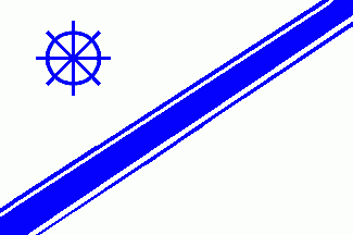 The white flag is divided by a blue cotized sinister bendy ribbon. In the upper hoist quarter is a blue steering wheel.