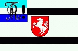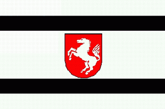 It is a white flag with 2 narrow black horizontal stripes, one in the upper half, the other in the lower half and a red shield with an uprising white horse (coat of arms of Prussian province of Westphalia)