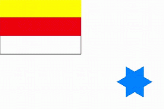 It is a white flag with a blue 6-point-star in the lower fly. The canton is a horizontal yellow over red over white tricolour (flag of the city of Münster).