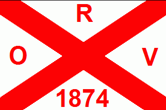 It is a white flag divided by a red saltire with red capital letters and numbers "O" (hoist), "R" (top), "V" (fly) and "1874" (bottom).