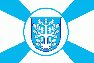 It is white flag. In ist centre is a celestial variant of the municipal coat of amrs in a white disc fimgbriated celestial blue. The flag has also celestial blue wedges in each corner converging in the centre.