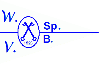 It is a white pennant nearly divided by a blue horizontal line. The line is superimposed by an white ovel edges blue and containing a pair of crossed blue keys with a "1926" below. The oval is flanked by dotted blue letters "W."(upper hoist), "V."(lower hoist),"Sp."(upper fly) and "B."(kower fly).