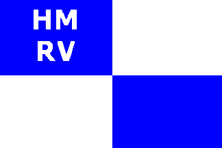 A quarterly divided flag into blue and white with white capital letters in the upper hoist "HM" over "RV". The club was established for males only.