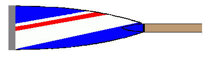 The blue flag was divided by two pairs of white horizontal stripes. In the centre of the flag was the logo of the club: In the centre a targe divided per fess into blue over white, superimposing two white oars crossed per saltire. The shield was crested by a pelican feeding its offsprings. At the top of the whole was some kind of mural crown.