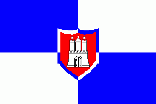 It is a quarterly divided blue and white flag. In the centre of the flag is a red shield containing a white Hamburg castle. The shield has a blue and white bordure counterchanged to basic colours of sheet.