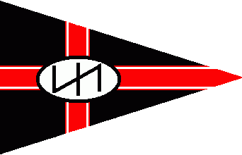 The black pennant is divided by an off centred, cotized red cross, superimposed by a white oval fimbriated black and displaying a black wolf trap, aka double hook. Due to the colours, the wolf trap and especially the name (völkisch), I assume, it had been a right wing sports organization before WW2.