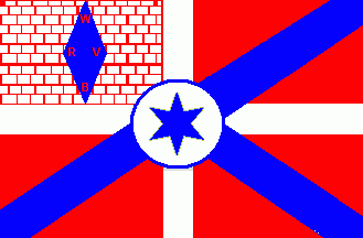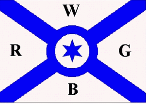 It is a white flag divided by a red saltire with black letters "W" (top), "R" (hoist), "G" (fly) and "B" (bottom). In the centre of the flag is a blue-edged white circle with a blue 6-point-star.