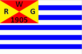 It was a horizontal 11-stripes flag with alternating white and blue stripes. The canton was divided per saltire into yellow (hoist and fly) and red (top and bottom) with a black inscription: "W"(top), "R" (hoist), "G" fly and "1905" (bottom)