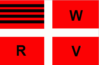 The red flag is divided by a white centred cross. The upper hoist quarter appears to be red divided by four black, horizontal stipes. In the other quarters are the initials of the club in black "W" (upper fly), "R" (lower hoist) and "V" (lower fly).