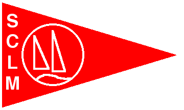 Red pennant with a white border, the letters "SCLM" in white placed vertically along the hoist, and two stylized sailing ships (two right triangles), red outlined white, on a stylized lake inscribed in a red disc fimbriated