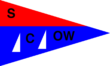Horizontally divided red-blue (1:2) pennant with the letter "S" in black in canton, the letters "C" and "OW" in black, each flanked by a white right triangle, in the the blue field. Ochtrup and Wettringen are two neighbouring cities located close to the Dutch border and the border with Lower Saxony near the city of Rheine.