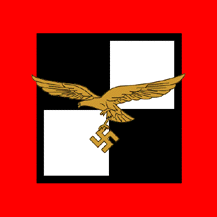 Obverse: A square light blue flag, at the center a Luftwaffe eagle, at each corner gold crossed batons surrounded by a gold wreath, the border gold decorated by gold swastikas. The reverse switches the position of wreathed batons and eagle (eagles at corners, batons at center). Introduced 1941. Illustrated in Flaggenbuch 1939, pl. VIIa (after 1941), Davis 1975, p. 142 (black and white) and [Roger James] Bender, The Luftwaffe, p. 287.