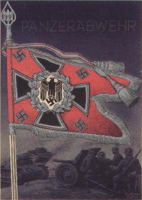 The design of these colors which dates from 1936 is: a square white flag with a black Iron Cross extending nearly to the edges of the flag; the cross has a silver border followed by a thinner black edge and a white fimbriation; in each corner is a black swastika. At the center of the flag is a white disk surrounded by a silver wreath and containing a black ("Army type", with wings directed downward) eagle grasping a black swastika - thus similar to the eagle that frequently appeared on Army steel helmets.