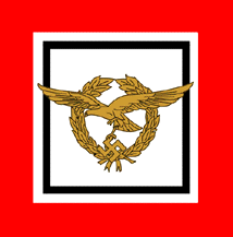A square white field with a narrow black-white and a broader red border. At the center, a gold laurel wreath with a superimposed gold Luftwaffe eagle with wings overlapping the black and white borders. Illustrated in Flaggenbuch 1939, pl. VII, Davis 1975, p. 105 and [Roger James] Bender, The Luftwaffe, p. 288.