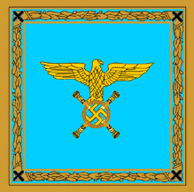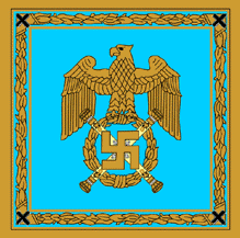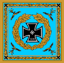 both by Jaume OlléObverse: a light blue field with a gold Nazi National Eagle grasping a gold wreath with swastika, behind which crossed marshal's batons. The border as in the earlier version. Reverse: like that of the earlier version, except the large 1939 Iron Cross is replaced by a 1939 Iron cross about half the previous size surrounded by a gold laurel wreath. Replaced earlier version in February 1941. Illustrated in Flaggenbuch 1939, pl. Vb, Davis 1975, p. 104 and [Roger James] Bender, The Luftwaffe, p. 285.
