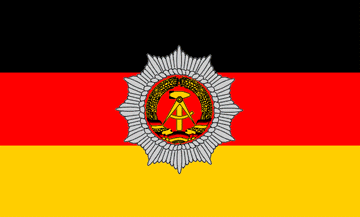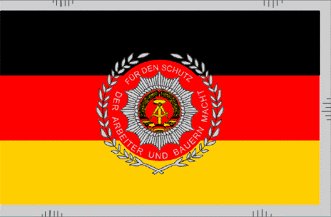 Similar to the National People's Army flag except with the Police Symbol (the Arms inside a 12 point white star, surrounded by a red circle with the letters FÜR DEN SCHUTZ DER ARBEITER UND BAUERN MACHT [For the protection of the power of the workers and farmers], surrounding the circle a silver wreath at the center). The flag is surrounded by a silver fringe (except at hoist). Ratio 3:5. Illustrated in Oliver 1993 [oli93], p. 3, 20.