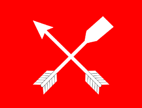 A red field, at the center crossed arrows one with spade shaped point in white.