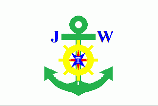It is a white flag with a green anchor in ist centre flanked by blue capitals "JW" at ist top. The anchor is superimposed by a yellow stearing wheel, which is superimposed by the star of Tiedemann incl. the "T".