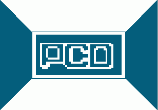 In the centre of the flag is a blue cotized rectangle containing blue capitals with a white fimbriation "PCO". The rectangle is flanked by two isosceles blue trapeziums touching the edges of both, flag and rectangle.