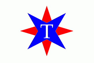 to the larger one; in center of blue a white serifed "T".