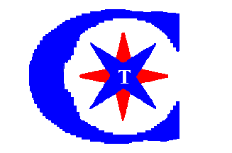 Carl Tiedemann Stauerei is a freight- and cargo company for transports by ship.The flag is white a red 4-point star pointing to the following directions clockwise 0gon, 100gon, 200gon and 300gon. The star is superimposed by a blue 4-point star pointing to the following directions clockwise 50gon, 150gon, 250gon, 350gon with a white capital "T" in its centre. The whole is surrounded by a big blue capital "C".