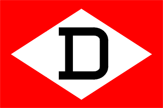 Dettmer certainly deserves a presentation but today I’ll just send an image of the flag, drawn, as it appears on the firm’s website: white diamond (almost touching the flag’s edges) bearing a black serifed initial ‘D’.
