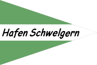 'Flaggen auf dem Rhein' (1952 ed.) shows a mainly green-and-white pennant for 'Gemeinschaftsbetrieb Eisenbahn und Häfen' (i.e. Communal Enterprise Rail and Ports) at Duisburg-Hamborn, founded in 1949. Horizontally divided green-white-green, black italic letters on the white stripe proclaiming "Hafen Schwelgern". Probably adopted in 1949, the pennant is perhaps no longer in use.