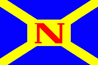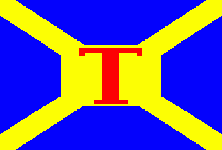 It is a blue flag divided by a yellow saltire. In its centre is a yellow rectangle containing a red, serifed, capital "T".