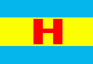 It is a yellow flag with celestial blue stripes at the top- and bottom-edge. In its centre is a red, capital "H".