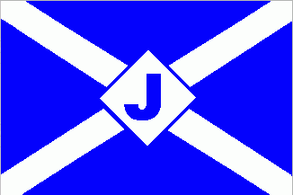 It is a blue flag, divided by a white saltire. In its centre is a white diamond fimbriated blue containing a blue capital "J".