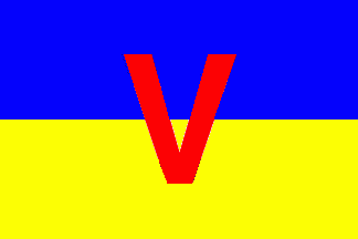 The flag is horizontally divided into blue over yellow superimposed by a red capital "V".