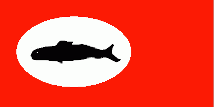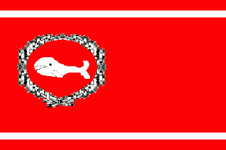 The ratio is approx 1:2. It is a red flag with a white oval shifted to the hoist. In the oval is the black silhouette of a sperm whale (not unequal to Soviet submarine of Typhoon class). The shade of the red colour is slightly orange in source. (my choice: RGB (255/26/0)). The flag is hoisted upon the stern of whaler "DIE SONNE", depicted by F.W.Stuhr, about 1680