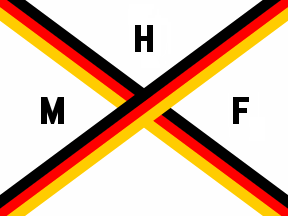 This page shows the house flag on third row, first picture, clickable (date of foundation given: 1991): Again, the white field with ascending and descending stripes in the national colours, suggesting a saltire (the ascending stripe in front), accompanied by black initials without serifs: "M" (hoist), "H" (top), and "F" (fly).