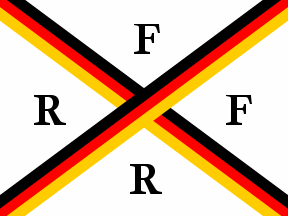 The first is white, German colours in saltire, black initials added: 'D' in the hoist, 'F' at top, 'K' in the fly. The ascending diagonal is put in front. No state emblem although it was to appear on the