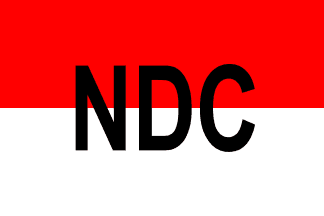 The flag itself is a red over white bicolour, charged with black capitals "NDC" across the center. The caption is quite blurred, but guessing a bit I can suggest that it reads something in the lines of "Neu Dampf Co.". There's a third word there, but that's too blurred for my mental OCR-tracer.