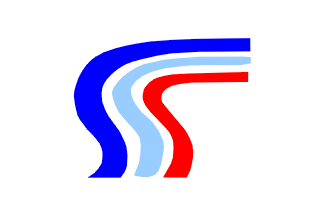 is white with a stylised "S" of 3 lines, 2 dark blue and 1 red, which can