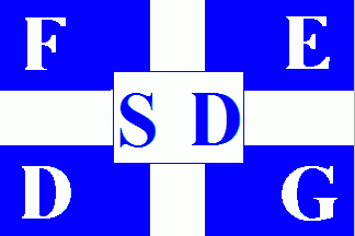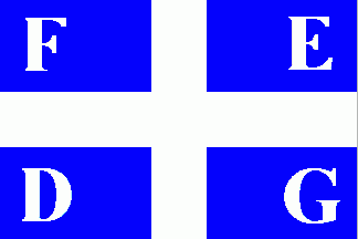 The blue flag was divided by a white centred cross. In the quarters were white initials "F"(upper hoist), "E"(upper fly), "D"(lower hoist) and "G"(lower fly).
