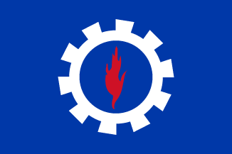 the time. Size of cog wheel seems to be 1/2 of flag length. Red flame in center.
