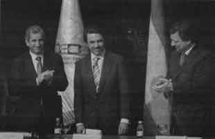 I seem to have spotted a flag that I cannot identify. It appeared in a photo published in the Portuguese newspaper Público on 10 December 2004, illustrating an article about problems in a governmental plan to restructure the energy sector in the country. The three suits in the photo are Durão Barroso, former Portuguese PM and current president of the European Comission, Carlos Tavares, former minister of energy (IIRC) of the Portuguese government and José Maria Aznar, former PM of Spain. It is, therefore, an archive photo, since none of these gentlemen still held their offices last December, and I believe it has something to do with MIBEL, an Iberian agreement in the energetic sector.
