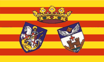 The modern flag of Alcoi is made of four horizontal red stripes on a yellow backgrounf, with in the middle the Royal coat of arms (I understand the coat of arms granted when the town became a Royal Town) and the early coat of arms of the town representing St. George, the whole surmounted by a Royal crown.