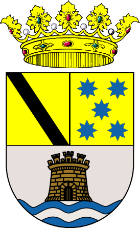 «Escudo cuadrilongo de punta redonda. Medio partido y cortado. En el primer cuartel, en campo de oro, cotiza de sable. En el segundo cuartel, en campo de oro, cinco estrellas de azur de ocho puntas cada una de ellas. En el tercer cuartel, en campo de plata, castillo de su color, mazonado y aclarado de sable, sobre olas de plata y azur. Al timbre, corona real abierta.» (La imagen de Banderas-16 lleva el escudo antiguo)
